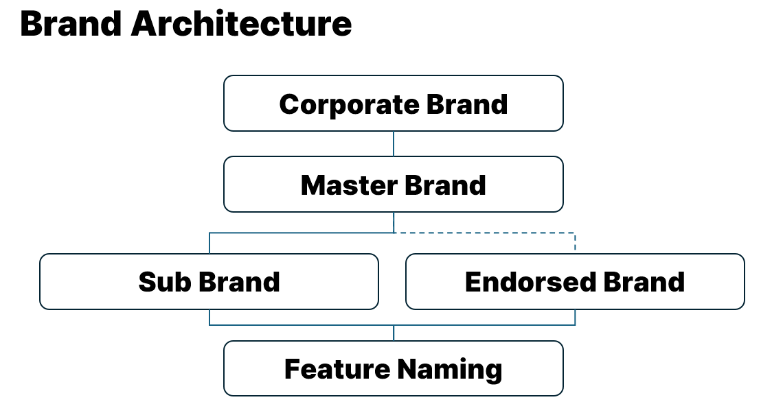 Brand naming is generally divided into the following hierarchy (though the structure and criteria may vary by company): Corporate Brand, Master Brand, Sub-Brand, Endorsed Brand, and Feature Naming. Each has its own role and purpose, and is chosen according to the company’s strategic goals and market situation.